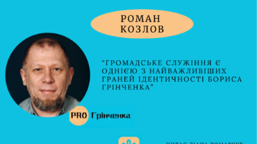 «Громадське служіння є однією з найважливіших граней ідентичності Бориса Грінченка» «Громадське служіння є однією з найважливіших граней ідентичності Бориса Грінченка» Професор нашого університету, співавтор монографії «Непокірний. Грані долі Бориса Грінченка», Роман Козлов, що наразі віддано захищає нас на фронті, зазначав: «Громадська робота – це те, що завжди подвигало Бориса Грінченка,…